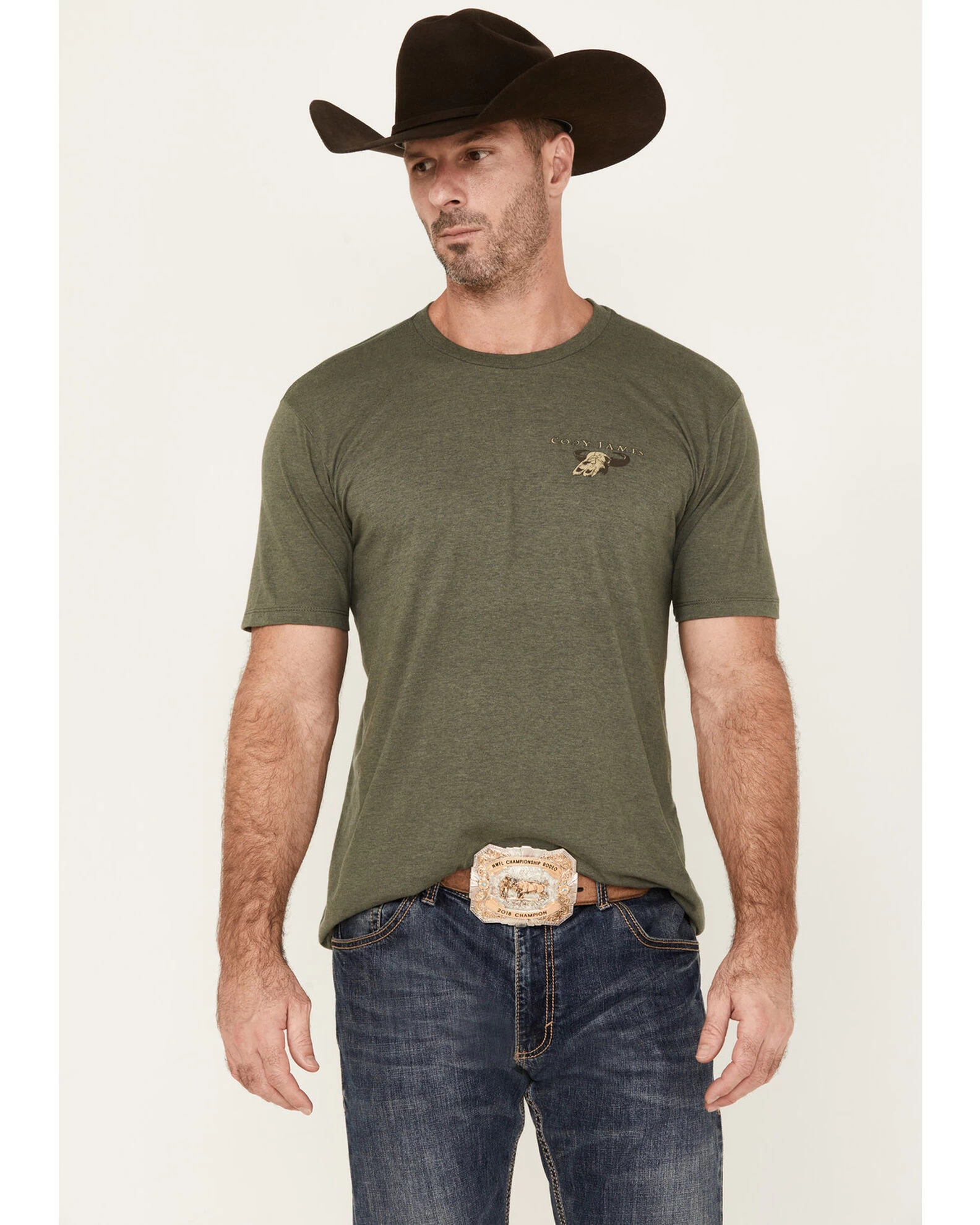 - Heather olive green design with “Cody James” and steer head skull graphic on left chest
