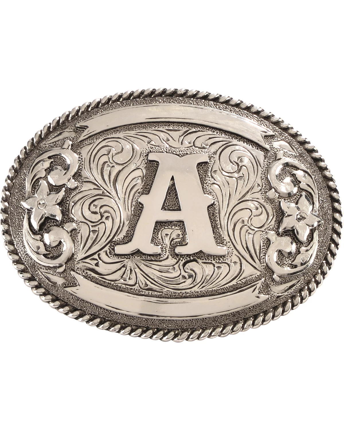 Proudly display the initial of your last name with this handsome belt buckle from Cody James. This oval shaped buckle has a bright silver tone finish with engraved initial, floral and filigree design. Twisted rope trim finishes the look. Wear with your favorite belts to add a touch of western flair to any ensemble.