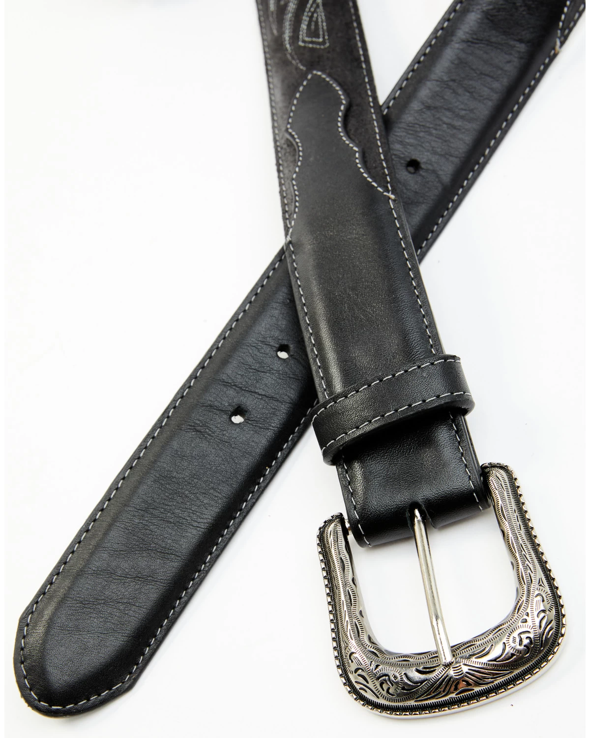 - Black with white contrast embroidered design and buckstitching
